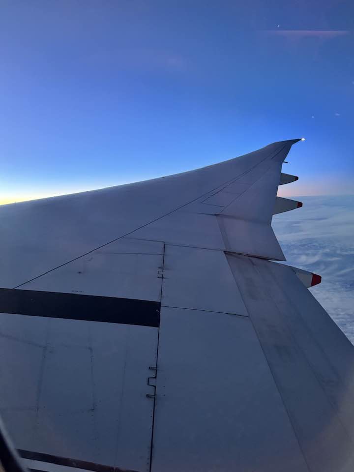 View of plane wing as sun is coming up. On plane rise from Frankfurt, Germany to Singapore, before coming to Thailand. Obviously, I had a window seat.